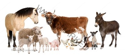 group of farm animals : cow, sheep, horse, donkey, chicken, lamb