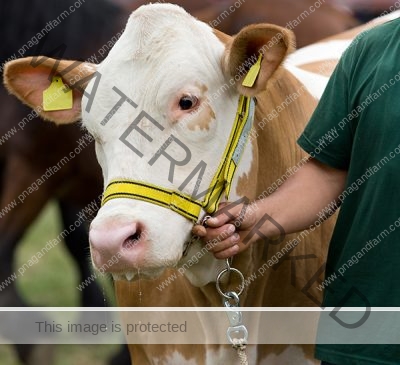 Simmental cow on leash